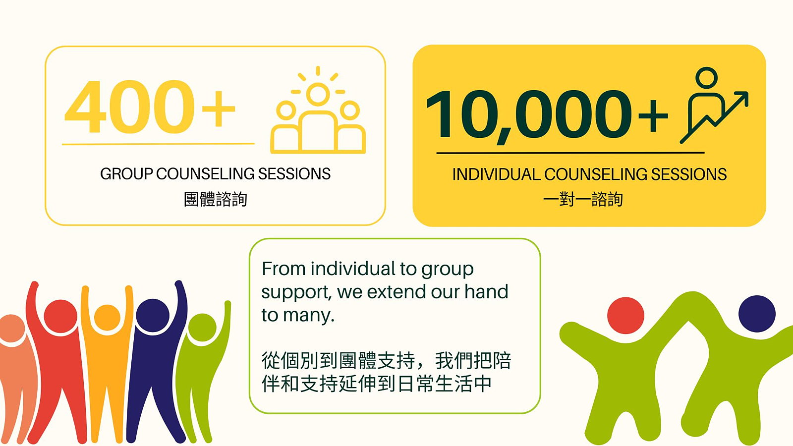 ✔️ Multilingual Warmline: Offering empathetic listening and confidential emotional support in Mandarin, English, and Cantonese